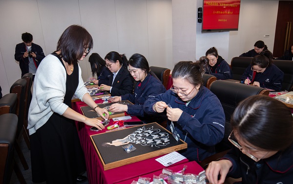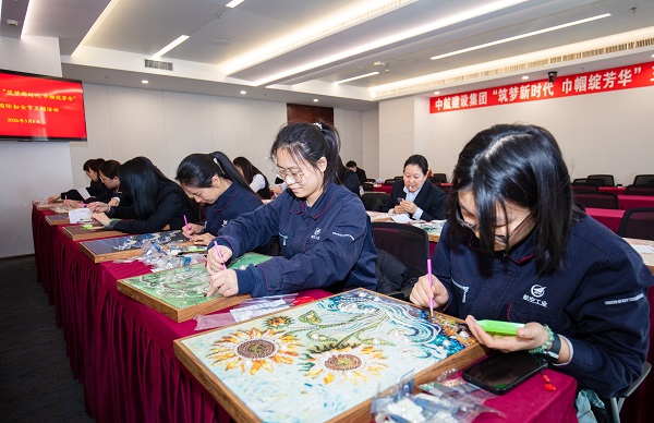 平日里忙碌于键盘间的“玫瑰”们,此刻化身为专注细腻的“生活艺术家”,或凝神构思,或左右交流,小心翼翼地用镊子夹起珍珠,沿着图案轮廓精心勾勒。